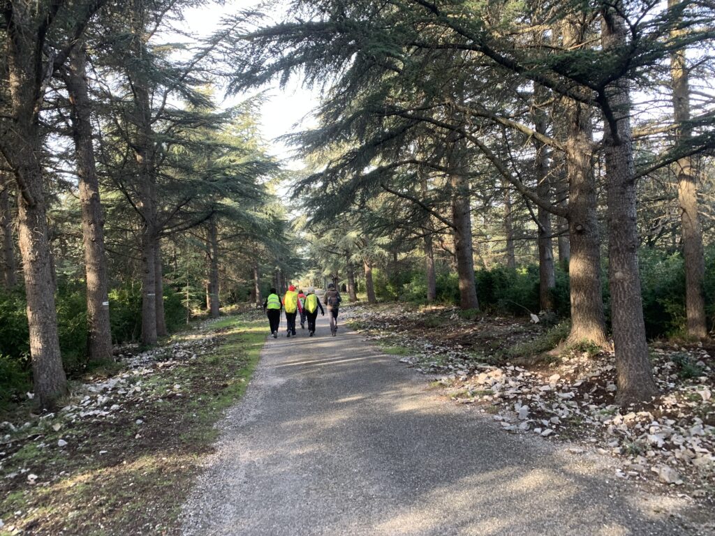Nous avons ensuite atteint la route forestière (goudronnée) bordée de majestueux cèdres qui nous a conduit jusqu’à la citerne proche du sommet des Fourcats, qui tire son nom des nombreuses combes qui partent du sommet et forment comme les doigts d’une fourche (fourcat en provençal).
