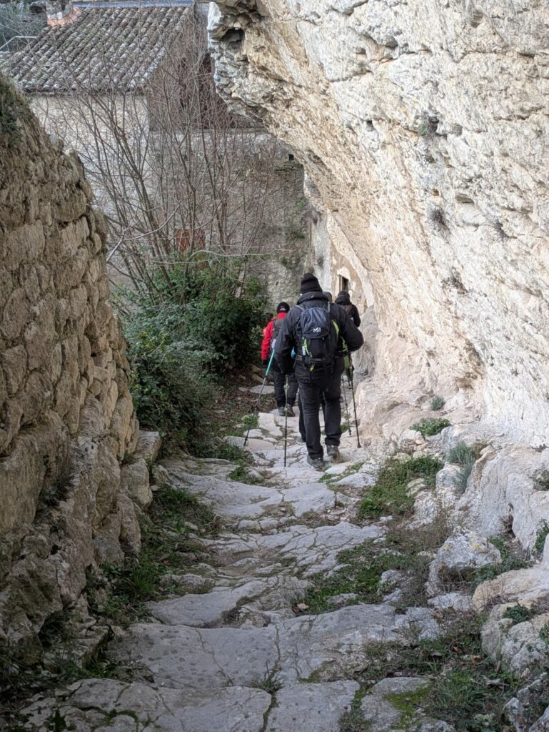 Après avoir garé nos voitures sur le grand parking aménagé en contrebas du village nous avons commencé notre randonnée en traversant un beau jardin agrémenté de sculptures topiaires (plantes taillées de manière décoratives), puis nous avons traversé le très authentique village d’Oppède-le-Vieux, totalement déserté à cette époque de l’année (à l’inverse des beaux jours où ce lieux attire énormément de monde…).