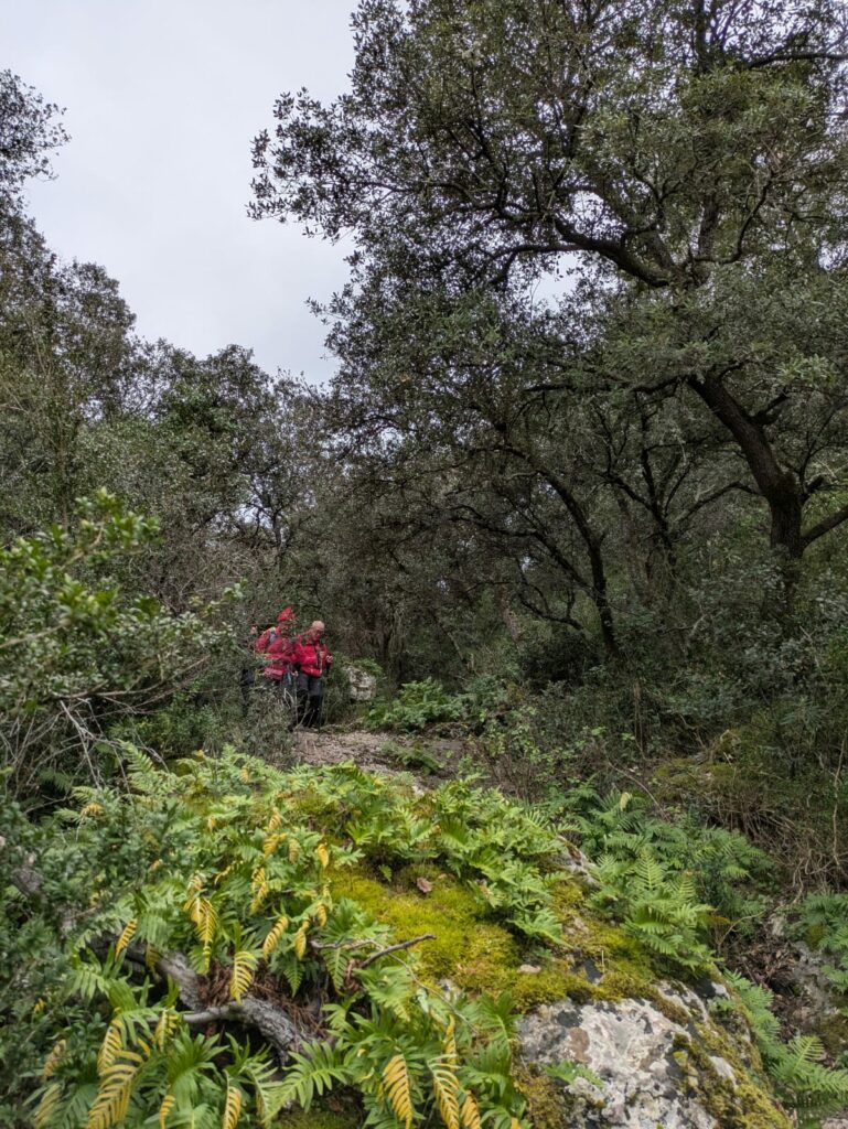 Après le repas nous avons quitté la route forestière pour commencer le retour vers la vallée sur un petit sentier encaissé cheminant entre les combes et vallons de la forêt de Pességuier pour finir par la draille de Maubec, une descente un peu ardue et glissante en raison des nombreuses pierres parsemant le chemin.