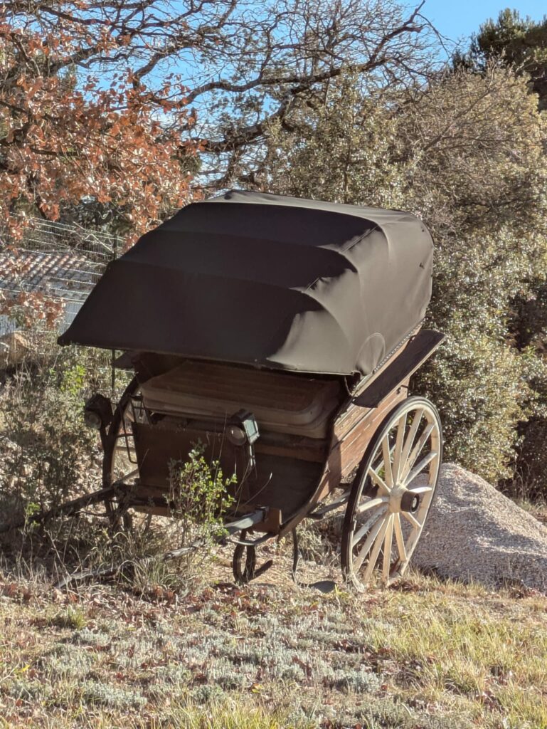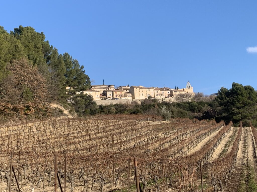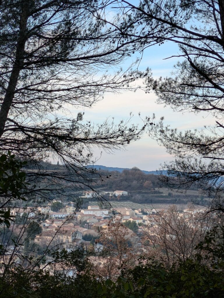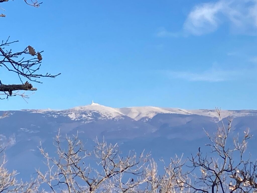 Il était un peu plus de midi quand nous avons fait la pause repas au bord d’une petite route, non loin de cette vaste carrière. Nous avons partagés un vin chaud et des parts de cake salé, puis quelques douceurs en fin de repas mais nous ne sous sommes pas attardés car malgré le soleil la température était encore bien basse pour cette heure médiane. Après le repas nous avons parcouru un sentier de découverte tracé au milieu de nombreuses restanques puis sommes arrivés au second point culminant de notre randonnée, à 400 mètres d’altitude, au niveau du village de Blauvac.